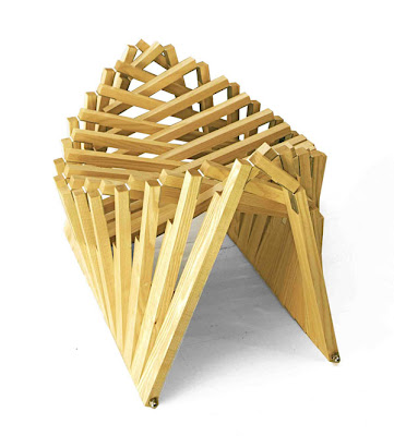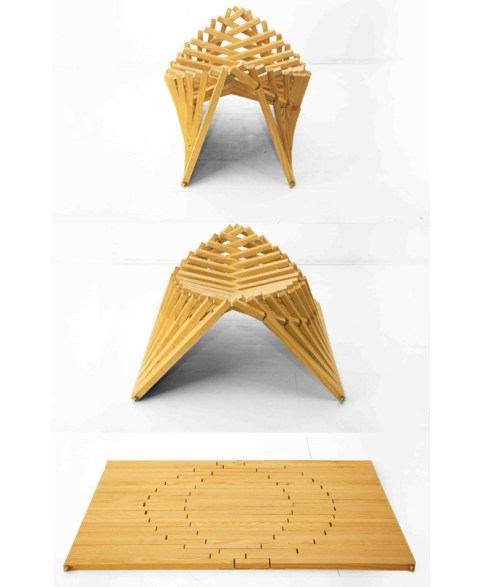 Robert Van Embricqs’in Nousevat huonekalut (“Rising Furniture”) ovat hämmästyttävä osoitus siitä, miten geometriset ratkaisut voivat pelastaa kalusteet liialta yksioikoisuudelta. Tarkalla suunnittelulla ja muutamalla kankaalla juovitetulla raolla voi nostaa levystä vaikuttavan istuimen tai pöydän. Tuoli on samalla yksinkertainen, mutta silti niin monimutkainen, että tällainen perustavis saa siitä toviksi ajateltavaa.