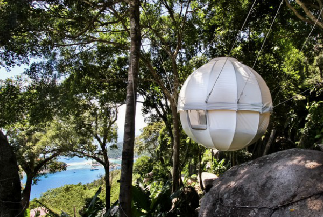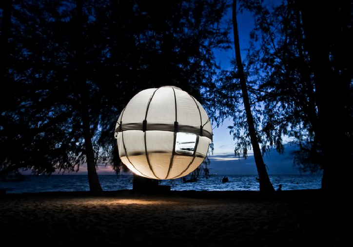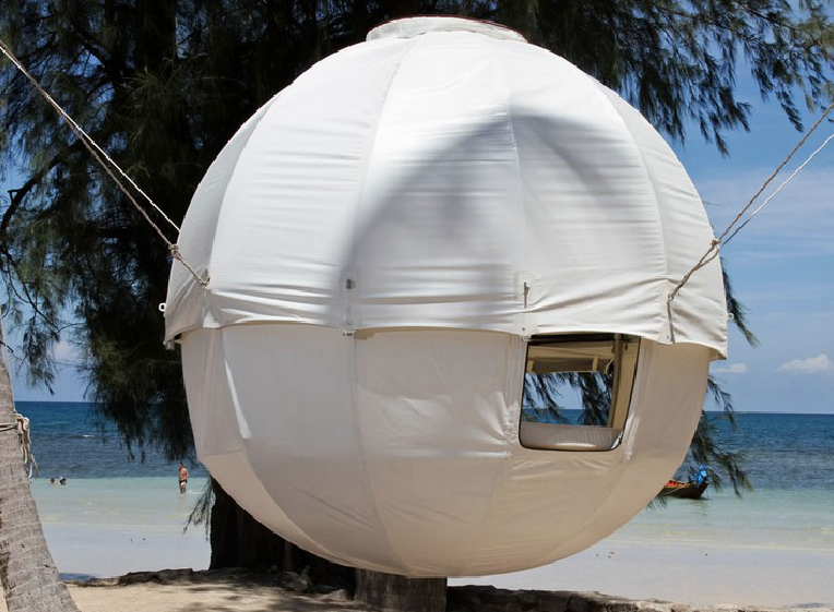 Kanadalinen The HemLoftin puinen maja sopii parhaiten jylhien mäntymaisemien juurakoihin, trooppinen siirreltävä Cocoon tree -teltta lämpöisten leveyspiirien löhöilyyn. Kevyt teltta jännitetään runkojen väliin. Sitten annetaan tuulen tuivertaa korvissa ja keinuttaa sisätiloihin sekä luksukseen tottunutta tylsää aikuista kehoa. Vedenkestävä pallo on kaunis silmille ja hämmentävä ihmiselle, joka on tottunut vakaaseen lattiaan, ilmastointiin, jääkaapin kylmään viinilasilliseen ja tietokoneen surinaan ympärillään. Mutta hei, kuinka rentouttavan kaukana se on arjesta. Asua nyt pallossa, ilmassa.