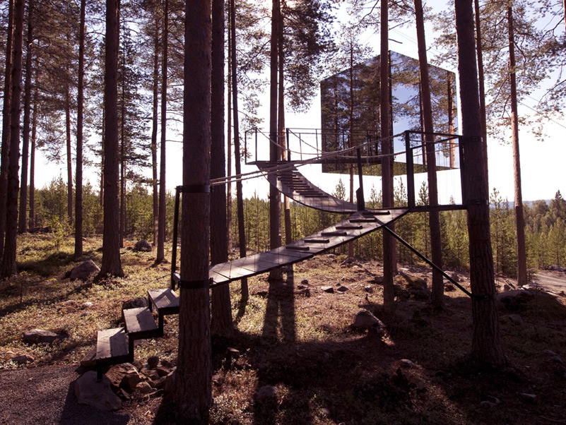 Ruotsalainen Tree Hotel tarjoaa huoneiden sijaan yksilöllisiä puuhun nostettuja metsämajoja linnunpesämäisestä risuhökkelöstä peileillä päälystettyyn kuutioon. Huoneiden sisustus on skandinaavisen hillitty, mutta ikkunoista avautuu koko metsän villi maailma.