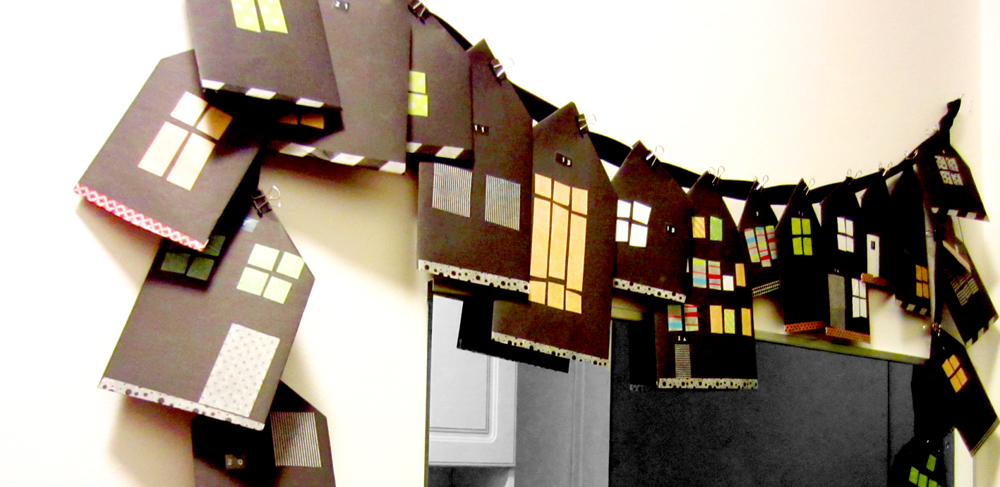 Tänä vuonna sain tehtyä ja ripustettua vihdoin oman kalenterin, jonne laitamme vuoropäivin yllätyksiä mieheni kanssa. Kierrätin vanhat kuvausrekvisiittana käytetyt mustat arkit kuoriksi, ikkunat ja ovet tein washiteippikokoelmistani, nipistimet hankin Tigeristä (25 kpl/2 e) ja nauhana toimii vanhasta mekosta askartelutarpeisiin säästetty vyö.