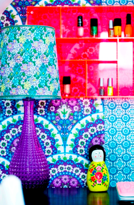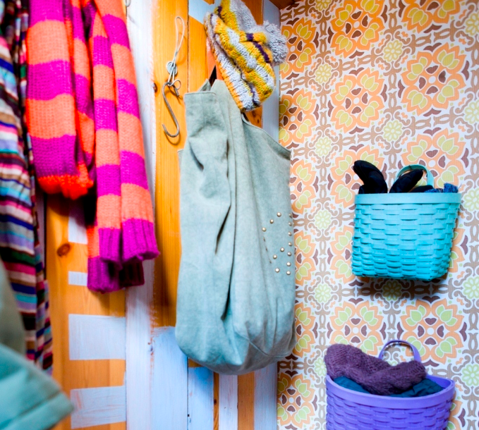 Värejä ei säästelty, eikä pintojakaan. Jopa kalusteiden päälliset kuten kaappien laatikot tai päädyt koristeltiin samaisilla – tai pahimmillaan – täysin kontrastisävyisin tapetein. Lie mitä hippejä olleet, mutta en nyt ihan huikeasta iloittelusta voi puhua. Värien ja kuvioiden sekasortoinen kakofonia oli toki provosoivaa, mutta vapaalle mielikuvitukselle, kuvioiden jatkamisen ja tunnelmien tasaantumiselle jätettiin tuohon aikaan vain neliömillimetrin kolo. – Ja ehkä siihenkin pikkureikään oli pakolla tungettu joku oranssin-sinappi kukkakuosi.