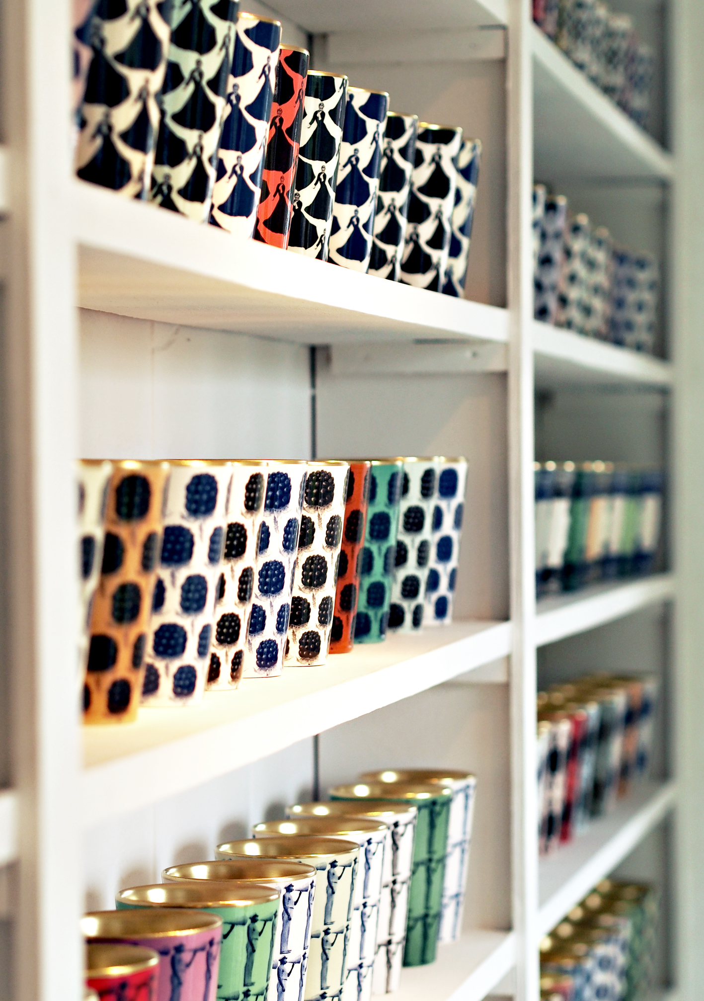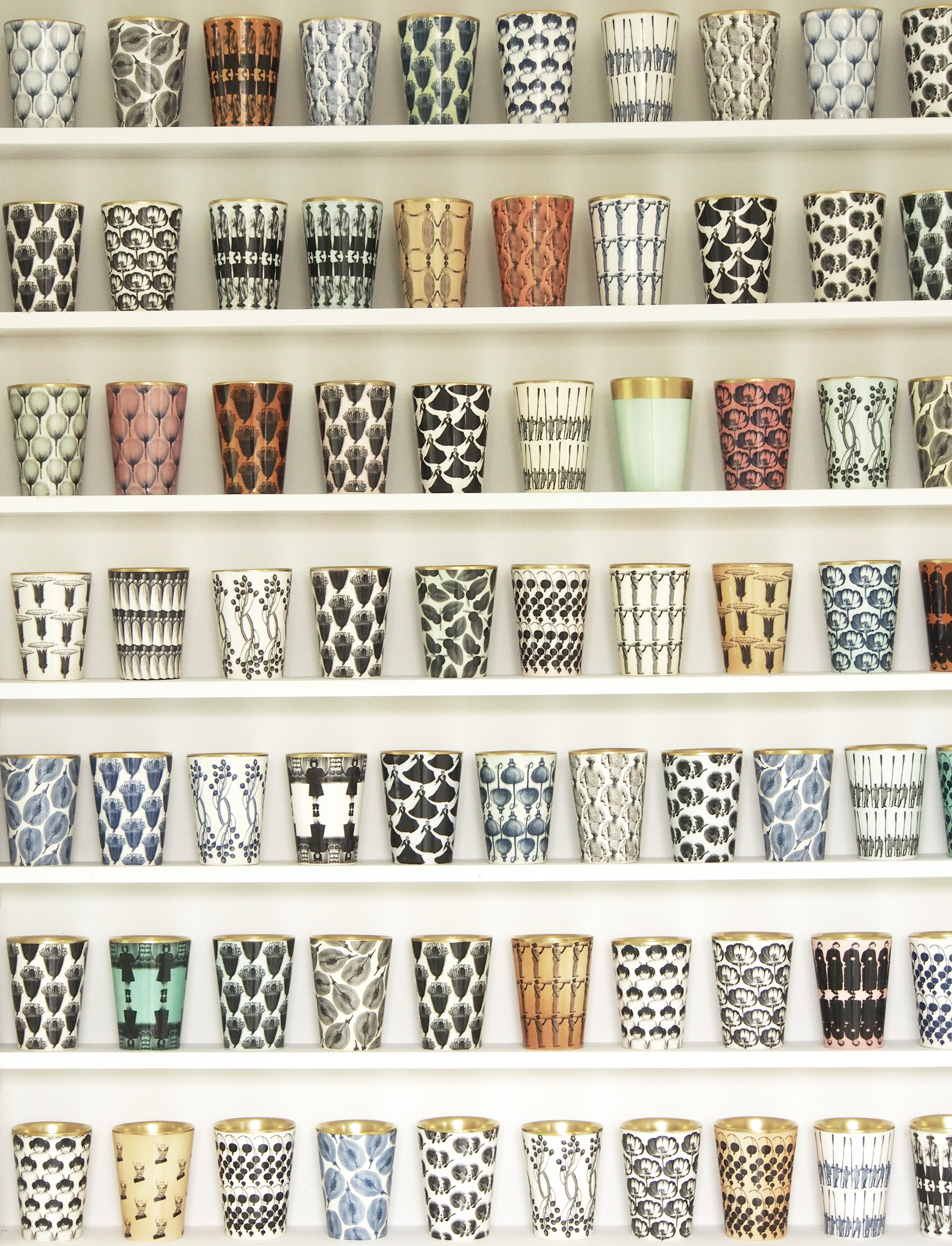 Minuun mukit eivät selvästikään tehneet vaikutusta kaukaa katsottuina, mutta lähietäisyydellä astioiden voimallisesti toistuvat kuviot toimivat täydellisesti. Ikonomaisia ihmishahmoja, kasvikirjamaisia marjoja, jopa hänen oma tyttärensä taaperoiässä. Upea, monimerkityksellinen kuvapinta ja kelmeilevä kultalasite sisäpuolella. Suurin myyntiartikla lienee mukikokoelma, mutta samat kuvat toistuvat myös erikokoisissa kynttiläkupeissa.