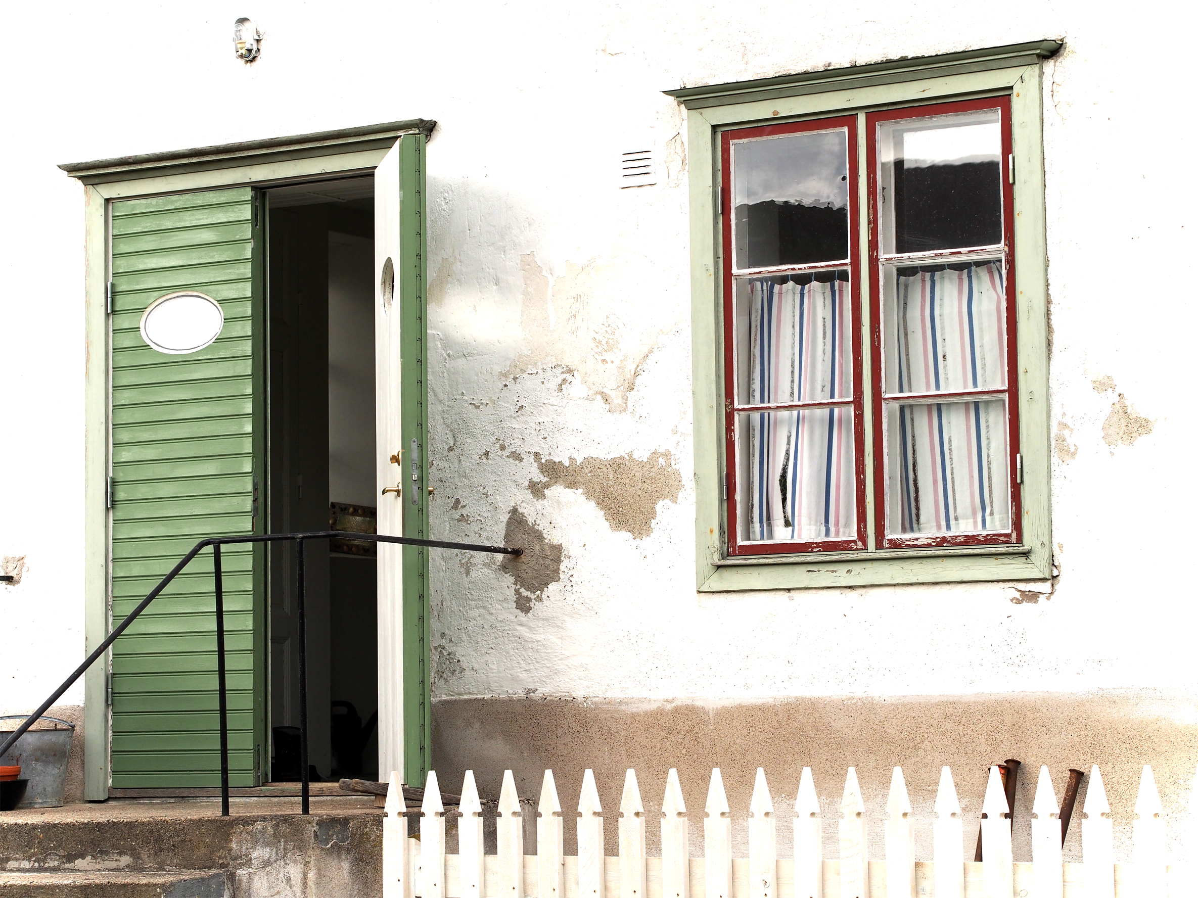 Päästessämme taiteilijan kaupan ja hänen ravintolansa pihamaalle tapasimme itse taiteilijan kotiasussaan. Ei kuitenkaan kalsareissa (toim.huom.). Onhan hänellä koti sentään toisella puolen samaista pihaa herkästi hilseilleessä, mahdottoman kauniisti rapistuvassa valkoisessa kivitalossa.