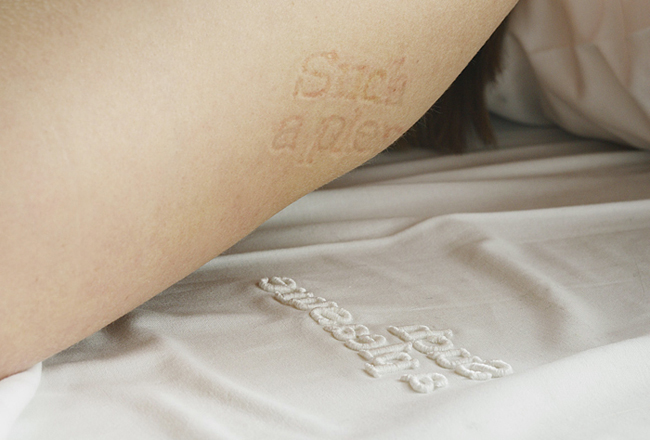Idean takana on vaasalainen Martina Carpelan, joka jo vuonna 2007 suunnitteli tämän Rise and Sigh -lakanan. Kuosi näyttää ensin ihan tavalliselta valkoiselta lakanalta, kunnes silmä osuu pieniin väärinpäin applikoituihin kirjaimiin. Kirjainten päällä nukkuminen jättää iholle pieniä sieviä viestejä sen mukaan, missä asennossa olet nukkunut. Eikä toimenpide taida oikeasti sattuakaan poskeen painautuvia tyynynjälkiä enempää.